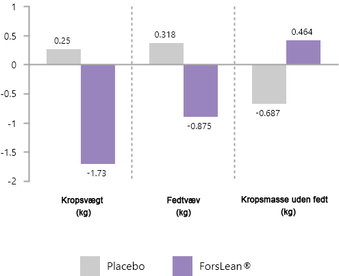 ForsLeans effekt er blevet bekræftet i dobbeltblindede undersøgelser, hvor forsøgspersoner, der havde brugt 250 mg ForsLean® i 12 uger, observerede en betydelig reduktion i kropsvægt og fedtindhold samt en betydelig stigning i mager kropsmasse sammenlignet med placebogruppen.